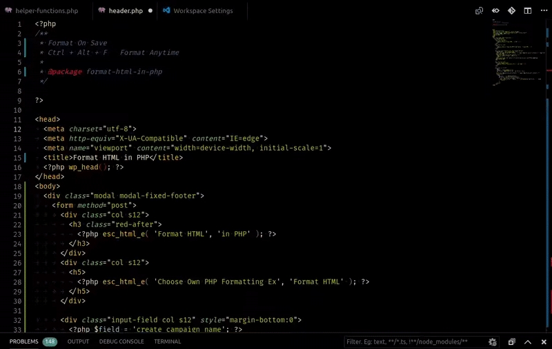 Format HTML in PHP - 格式化 PHP 文件中的 HTML. 在保存操作之前運行,因此您仍然可以使用 PHP 格式化 程式.