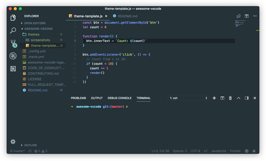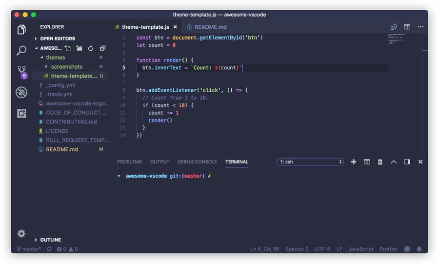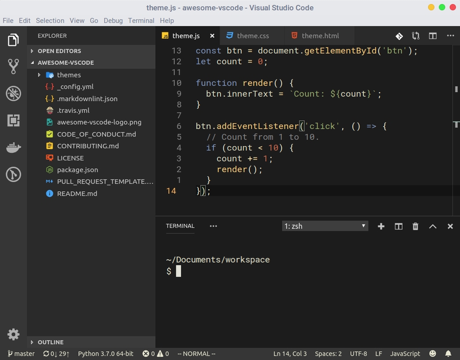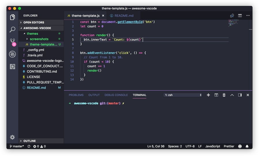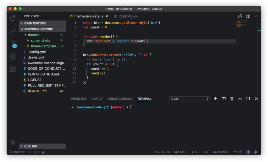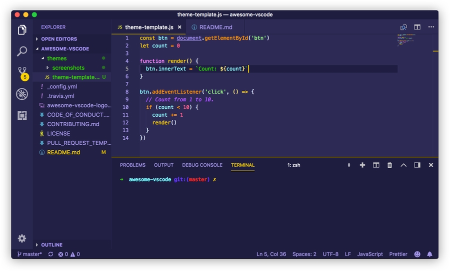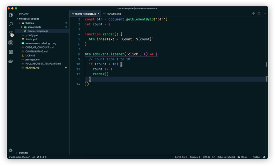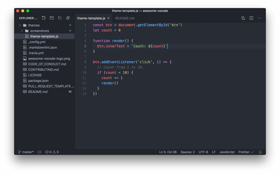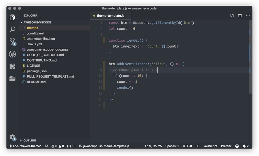 夜貓子的 VS Code 主題. 在白天也能很好地工作,但這個主題非常適合我們這些喜歡在深夜編寫程式碼的人. 顏色選擇考慮了色盲和光線不足的人可以使用的顏色. 決策還基於有意義的閱讀理解對比和最佳炫目效果. ✨