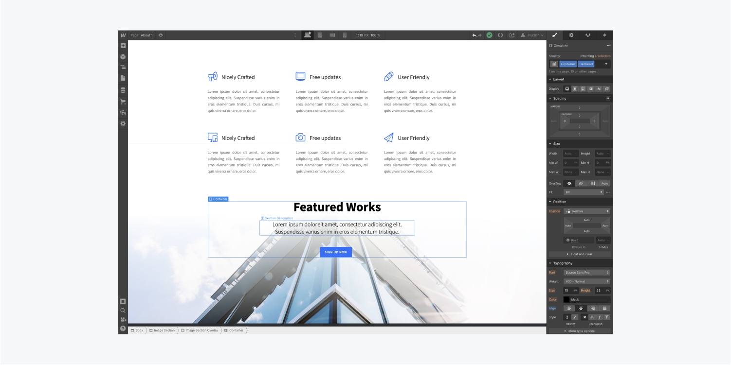 我們為 Webflow 提供的是一種在構建網站時更快、更高效的方式。通過在畫布上直觀地創建和操作內容,我們可以直接與我們的 HTML、CSS 和屏幕上的所有其他內容進行交互。使用 Webflow,您可以直接連接到您正在操作的媒體。