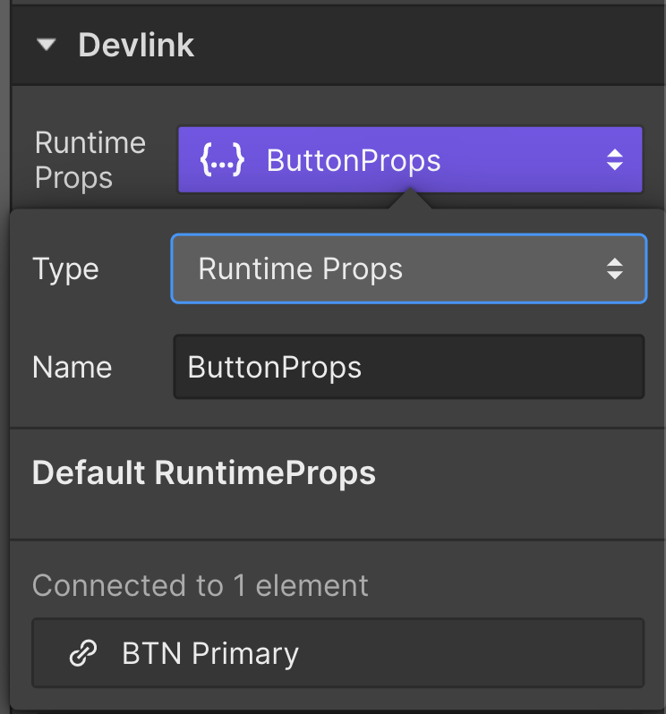 運行時道具可用於包括 Webflow 未涵蓋的道具,例如事件處理程序或其他任意道具,例如,可以由第三方庫提供的道具。通過向元素添加運行時 props 屬性,DevLink 編譯器將向您的組件添加一個新屬性並將其傳播到分配給它的元素中。