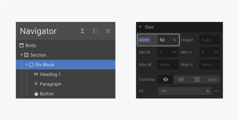 你可以使用 Container 中的 Div Block 使用Layout、Spacing、Size 和 Position 等樣式來組織元素。