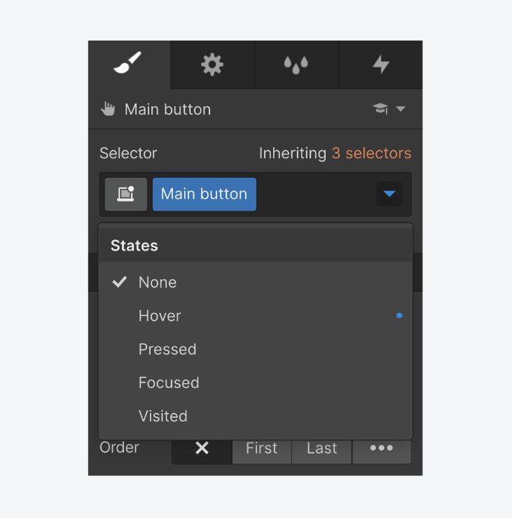 如果單擊樣式面板中的選擇器字段,你可以看到所有按鈕狀態。默認情況下,按鈕上沒有 Hover 的樣式。也可以單擊下拉列表中的 Hover 狀態,以修改 Hover 時在按鈕上時的外觀。