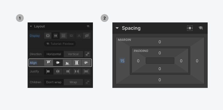 若要在按鈕內對齊圖標,請更改樣式面板中佈局下的設置(例如顯示:居中,對齊:居中)並調整間距下的邊距。