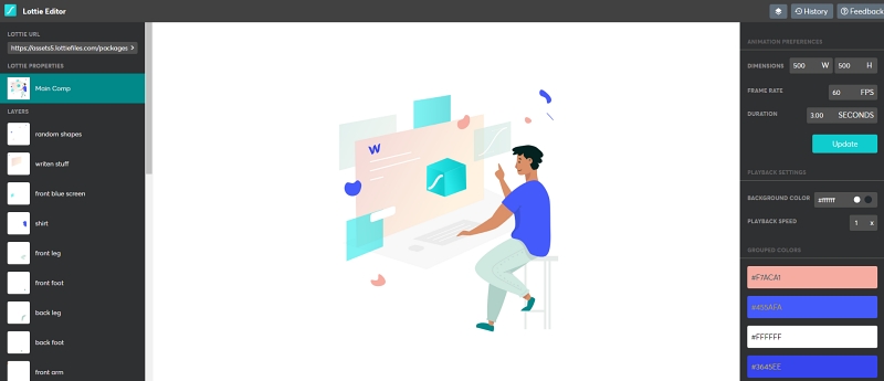 Lottie有一個很簡易的編輯功能,你可以將Lottie的檔案透過 lottie editor 編輯器,隨意的改變元素中的顏色配置,但請注意編輯器不是開發工具,頂多是改變顏色或是添加文字,不能調整作品的時間軸或元件原有位置。