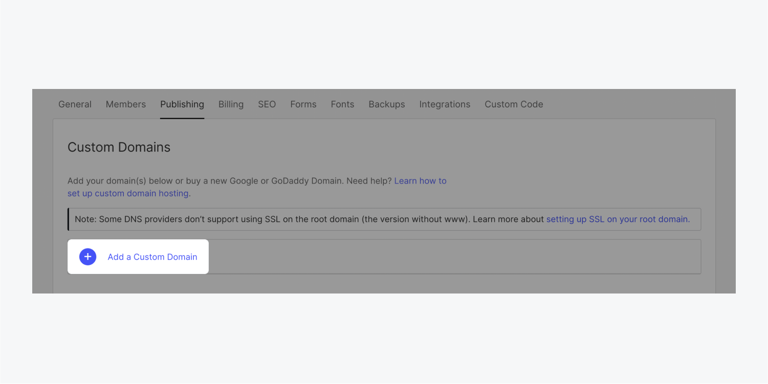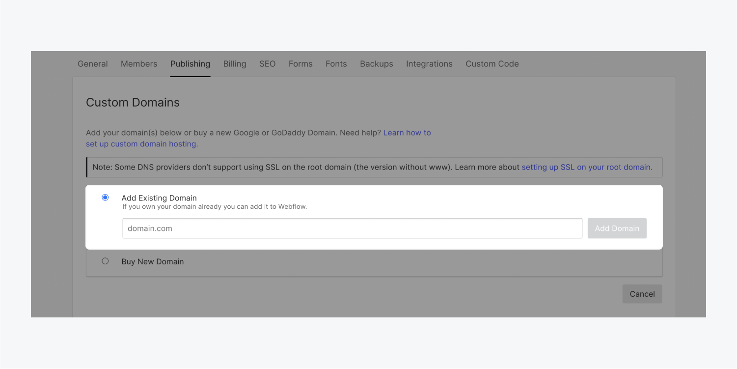 單擊"添加自定義域",並在"添加現有域"字段中輸入根域(例如,yourdomain.com)--這將把根域(例如,yourdomain.com)和www子域(例如,www.yourdomain.com)都添加到您的網站中