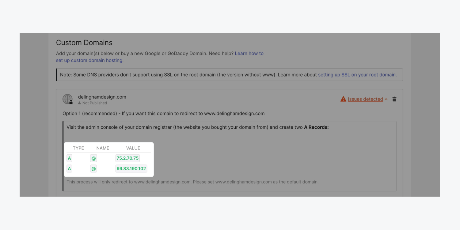 專業提示 您可以從網站設置>發布選項卡>自定義域中複製必要的DNS記錄。