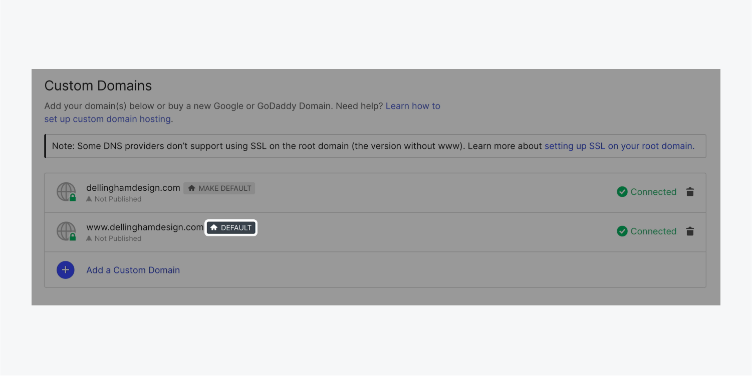 重要提示 如果您在已經設置了一個默認域名之後再添加一個新的域名或子域,新的域名或子域將不會出現在發布選單中。要解決這個問題,請打開網站設置 > 發布選項卡 > 自定義域,並點擊默認域旁邊的"使默認"按鈕。然後,將您的網站發布到新的域或子域,並再次設置默認域。