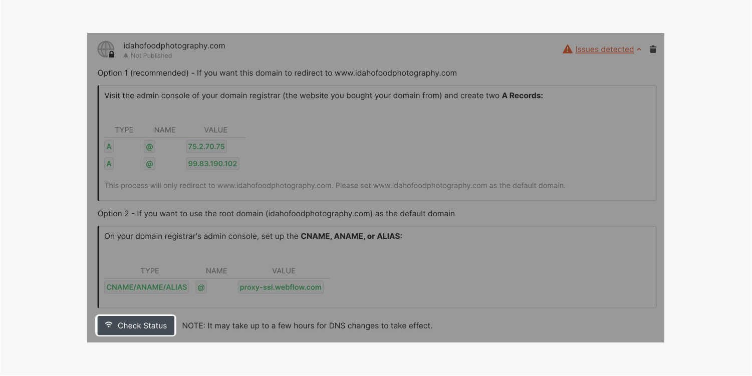 要驗證您的DNS設置是否正確,以及您的域名是否正確地指向您的Webflow網站,請在網站設置>發布標籤>自定義域中的域名下單擊檢查狀態。