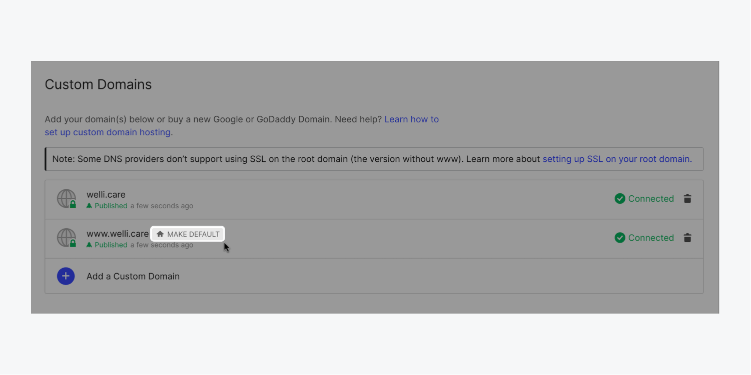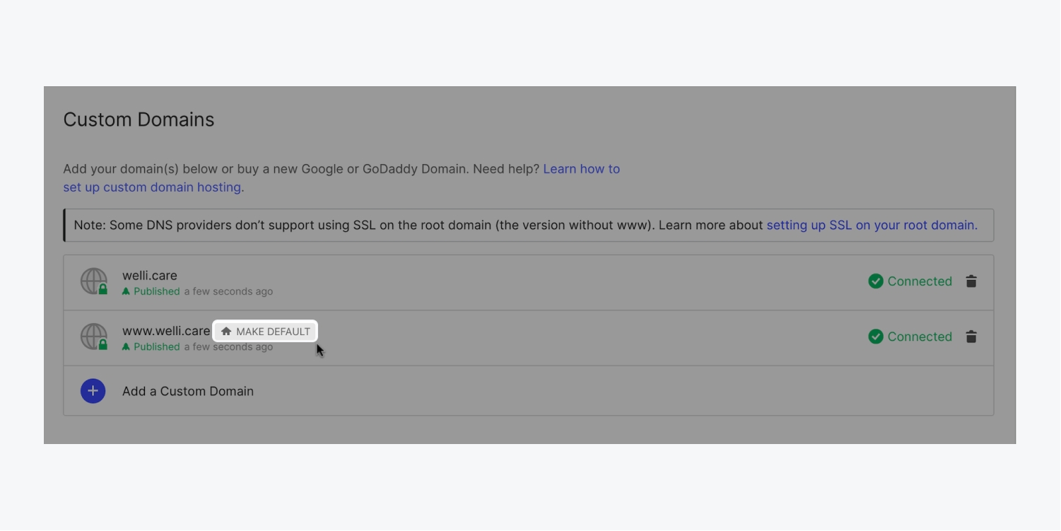 設置一個默認域名也是將任何舊域名重定向到新域名的一個好方法。 連接您所有的域名,新的和舊的,然後將其中一個新的域名設置為默認域名,並發布到默認域名。