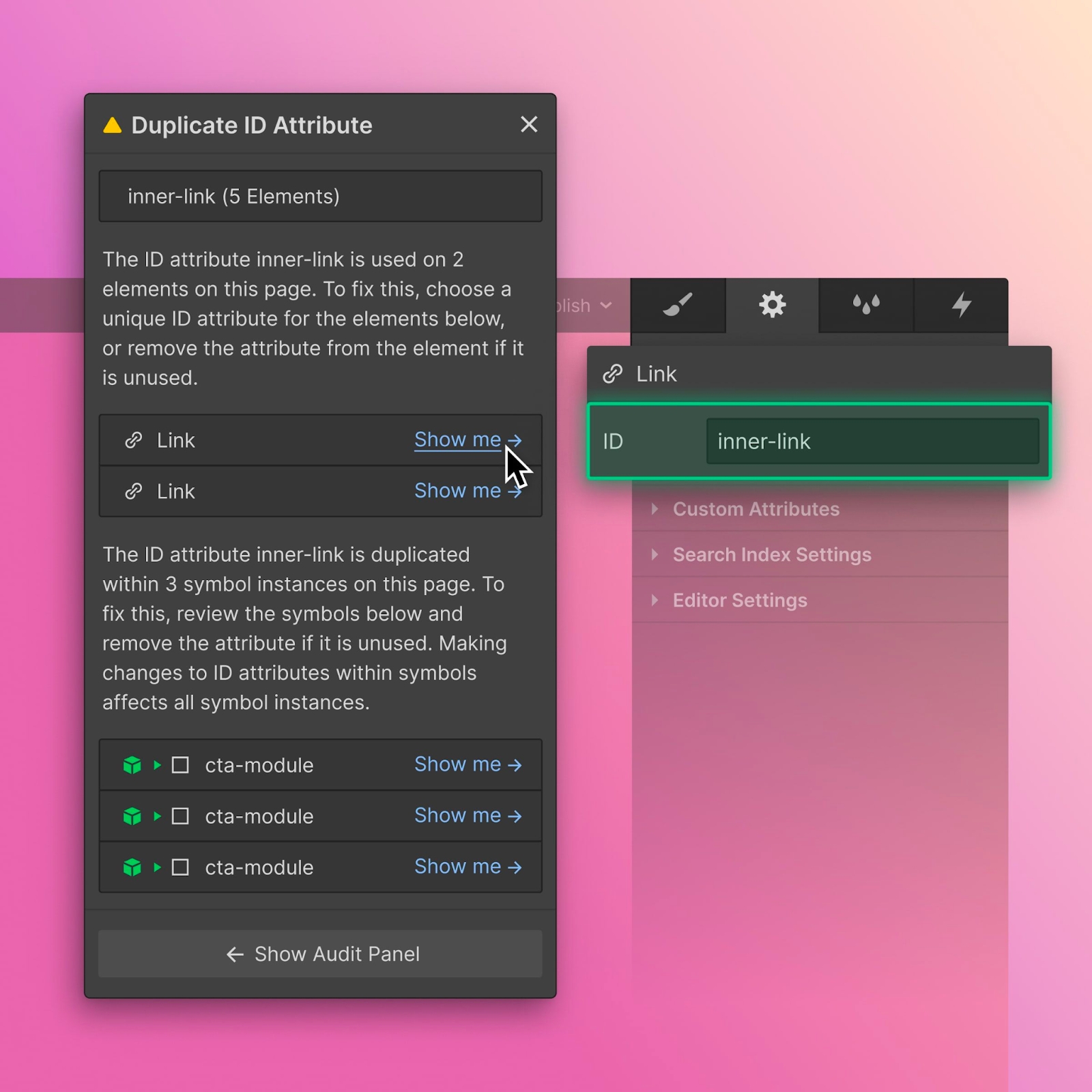 這就是為什麼我們在審核面板 (Audit Panel) 加入了一項新的可訪問性檢查,幫助你檢測每個頁面上的 ID 並協助設計人員找出並更正重複的 ID。