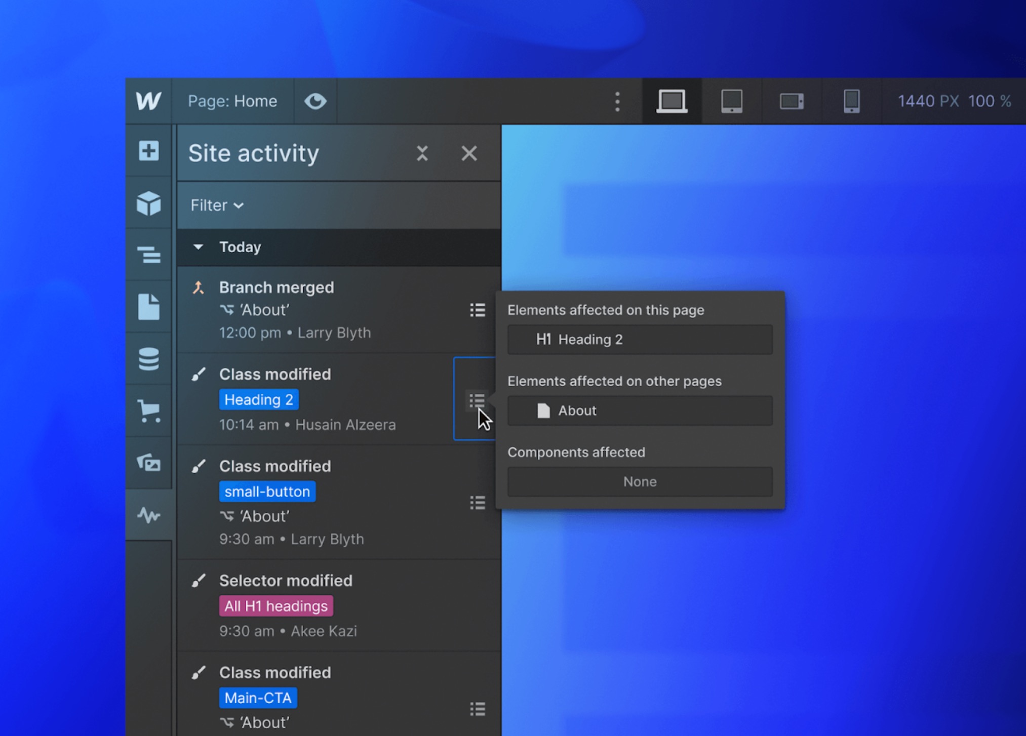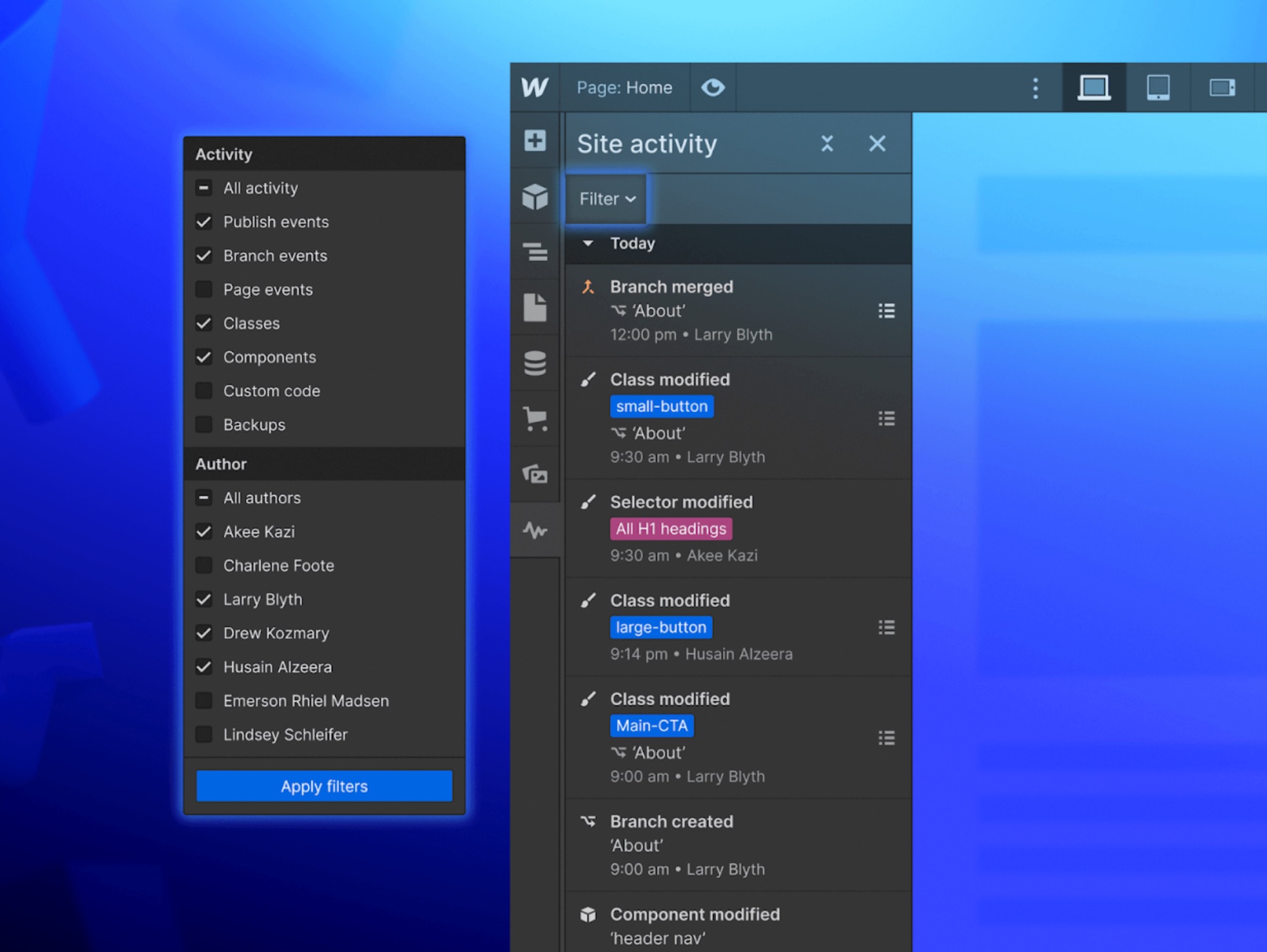 今天,我們為大型團隊提供了消除噪音的能力,並使用過濾器在站點活動日誌中快速找到他們需要的內容——今天可供Webflow 企業客戶和企業合作夥伴使用。