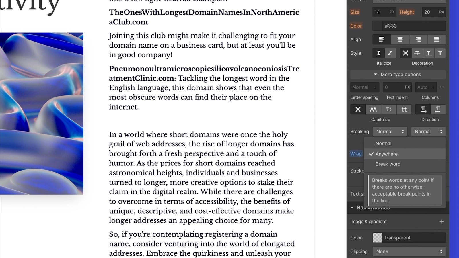 斷字(“word-break”CSS 屬性)和文字換行(“overflow-wrap”CSS 屬性)是 Webflow Designer 現在支援的兩個最新 CSS 屬性,允許更靈活地控製文字的顯示方式。