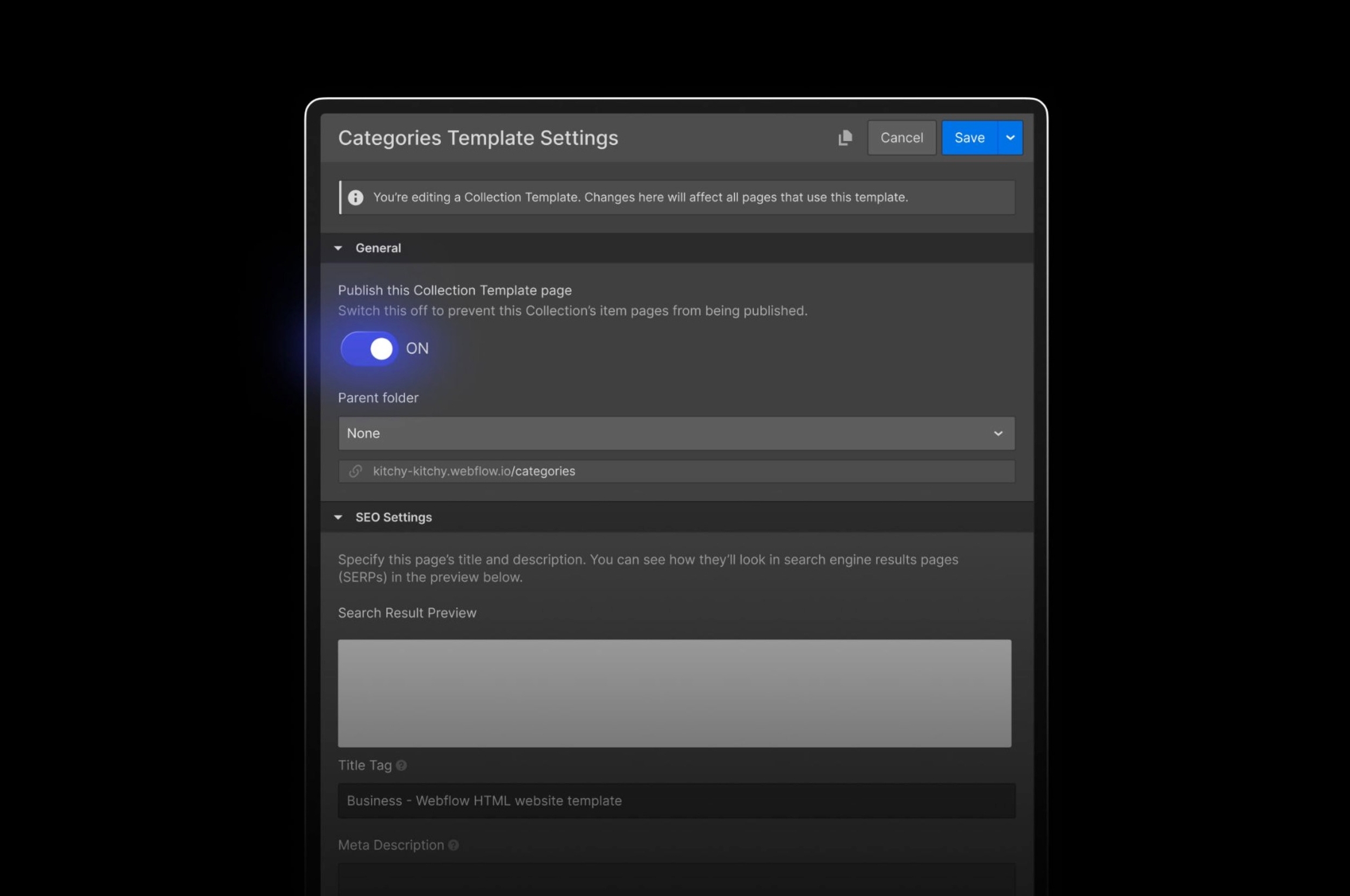 對於你創建的每一個 Collection,Webflow都會生成一個對應的模板頁面。除非您首先對空白模板頁面進行更改,否則這些模板頁面不會發佈到您的站點地圖中——但在今天之前,一旦您進行了更改(無論更改有多麼小),這些模板頁面就會生效並被搜索索引引擎。