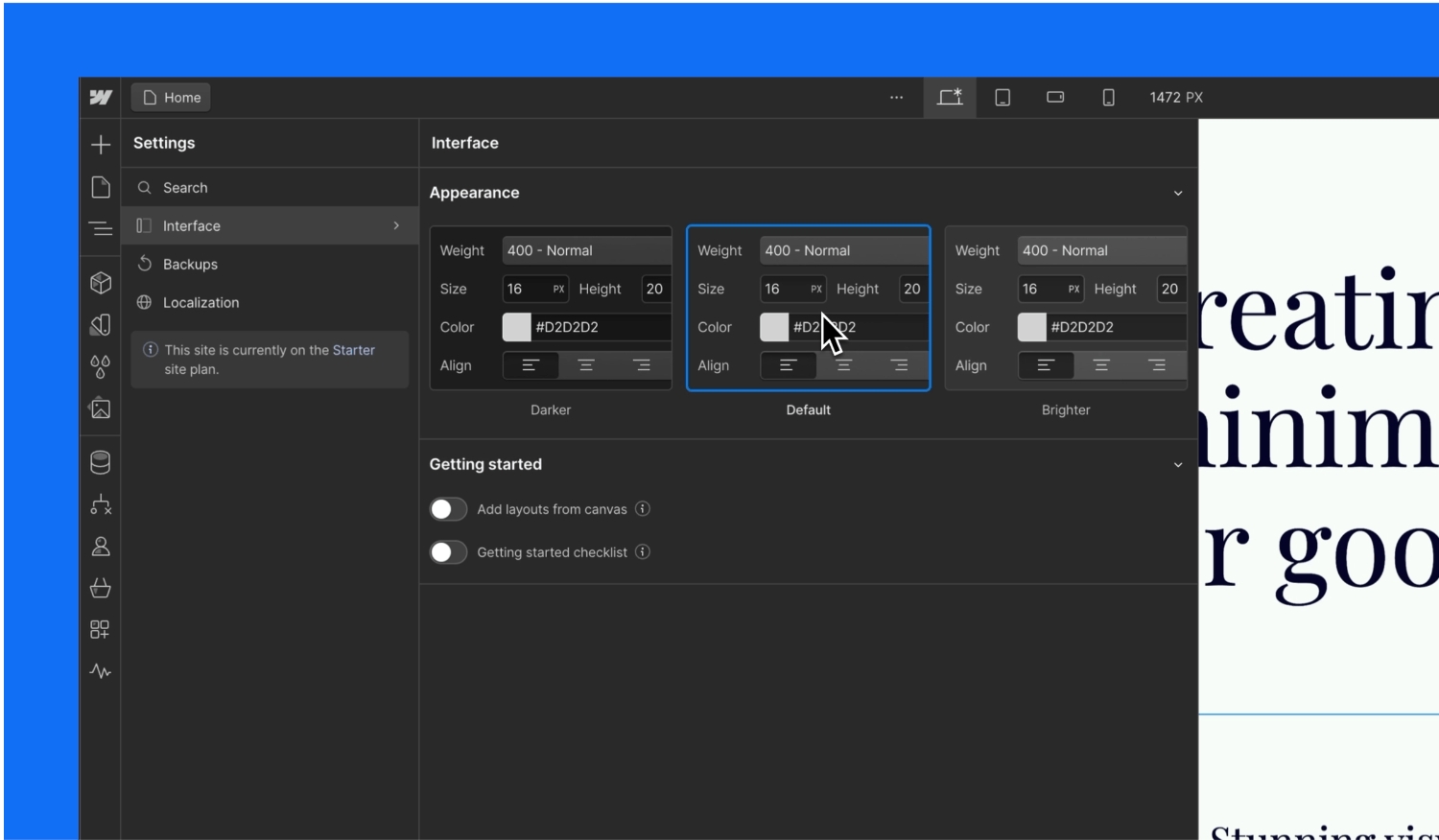 為 Webflow Designer 選擇更亮或更暗的顯示設定。