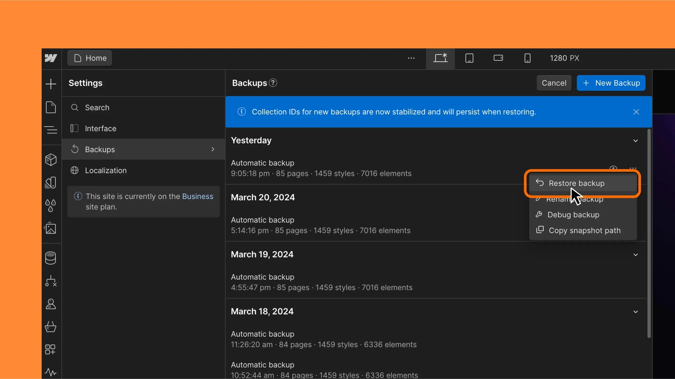 先前,復原網站備份會導致 CMS 集合和專案 ID(以及電子商務、頁面和資產 ID)重置,從而要求開發人員重新配置與這些 ID 無關的任何 API 連線。