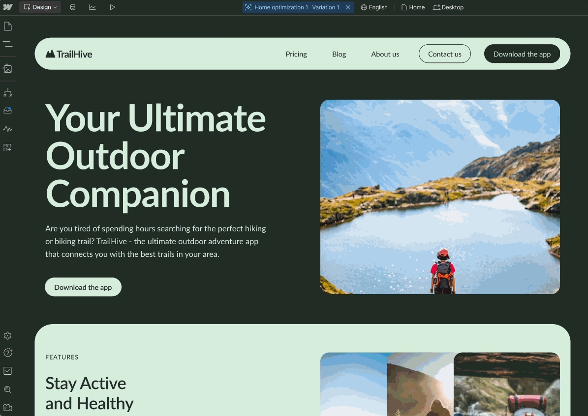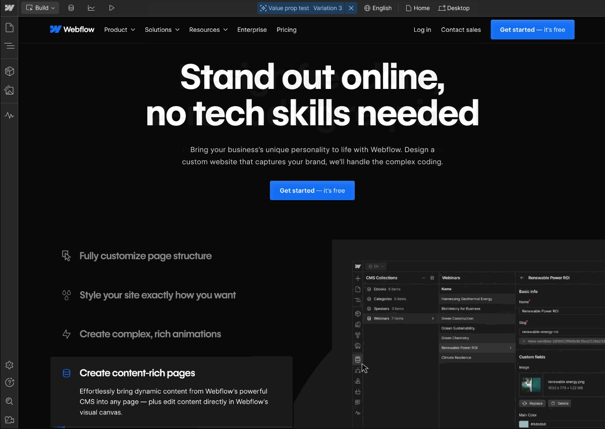 A/B 測試:創建測試以了解不同內容格式、標題、圖片和 CTA 的表現。使用 Webflow,您只需點擊幾下即可設置從小到文案更改、大到全站元素的測試。