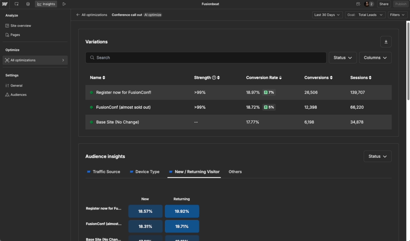 Webflow Optimize 為行銷人員提供了一套全面的工具包,以便在 Webflow 中為網站訪客創造量身定制的體驗。