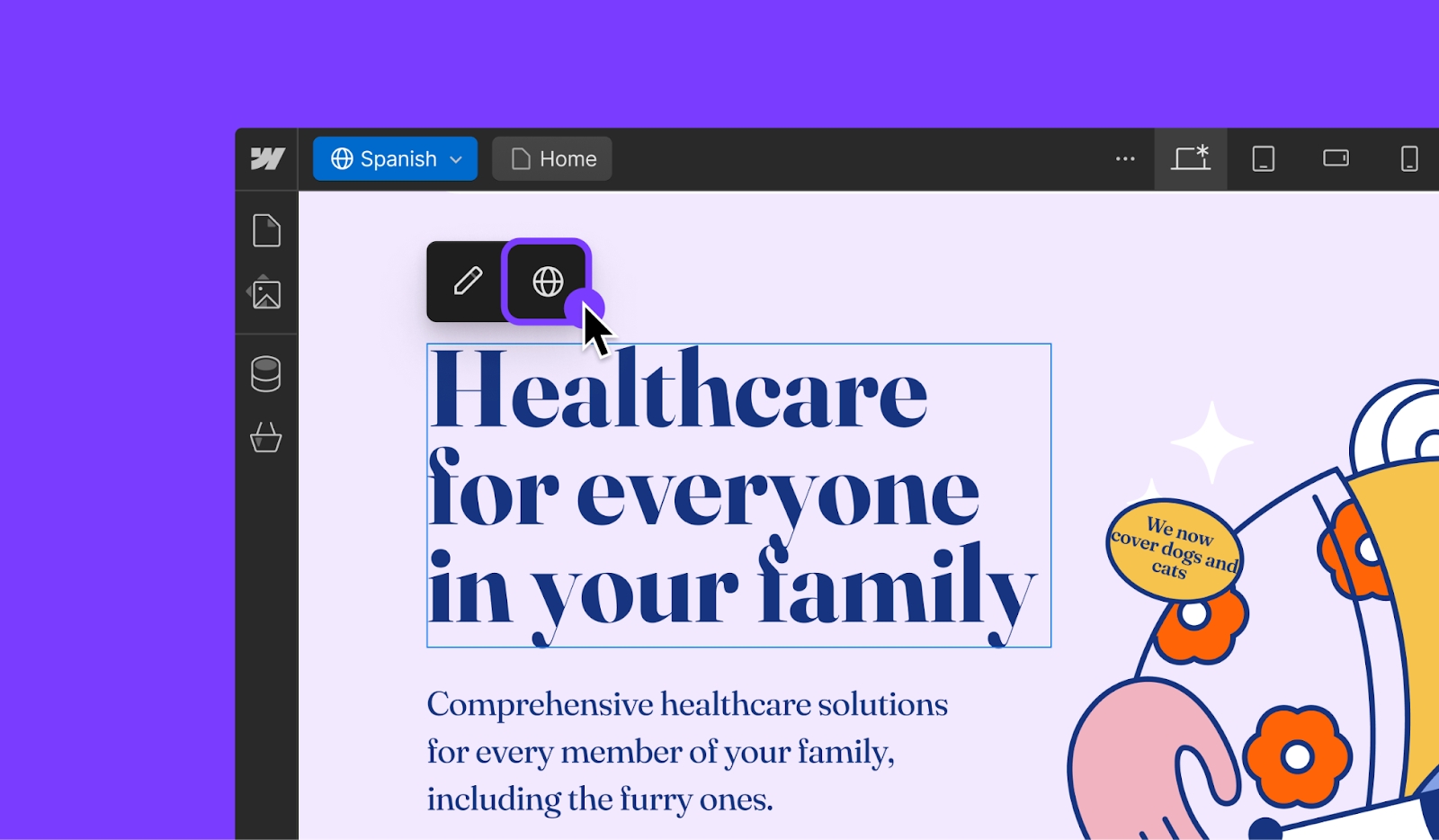 透過機器翻譯更快地在地化內容。當您在編輯模式下自訂特定區域設定時,您現在將看到單擊文字元素或圖像上的“地球”圖示以快速機器翻譯文字或替代文字的選項。