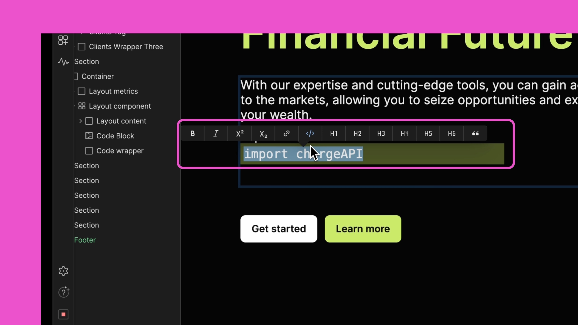 繼續程式碼系列,類似於將 Rich text 欄位(或元素)的一部分設定為粗體或_斜體的方式,_現在您也可以將文字定義為程式碼。與所有其他內聯格式一樣,您可以設定所有程式碼標記的樣式,以定義您希望程式碼在網站上預設顯示的方式。