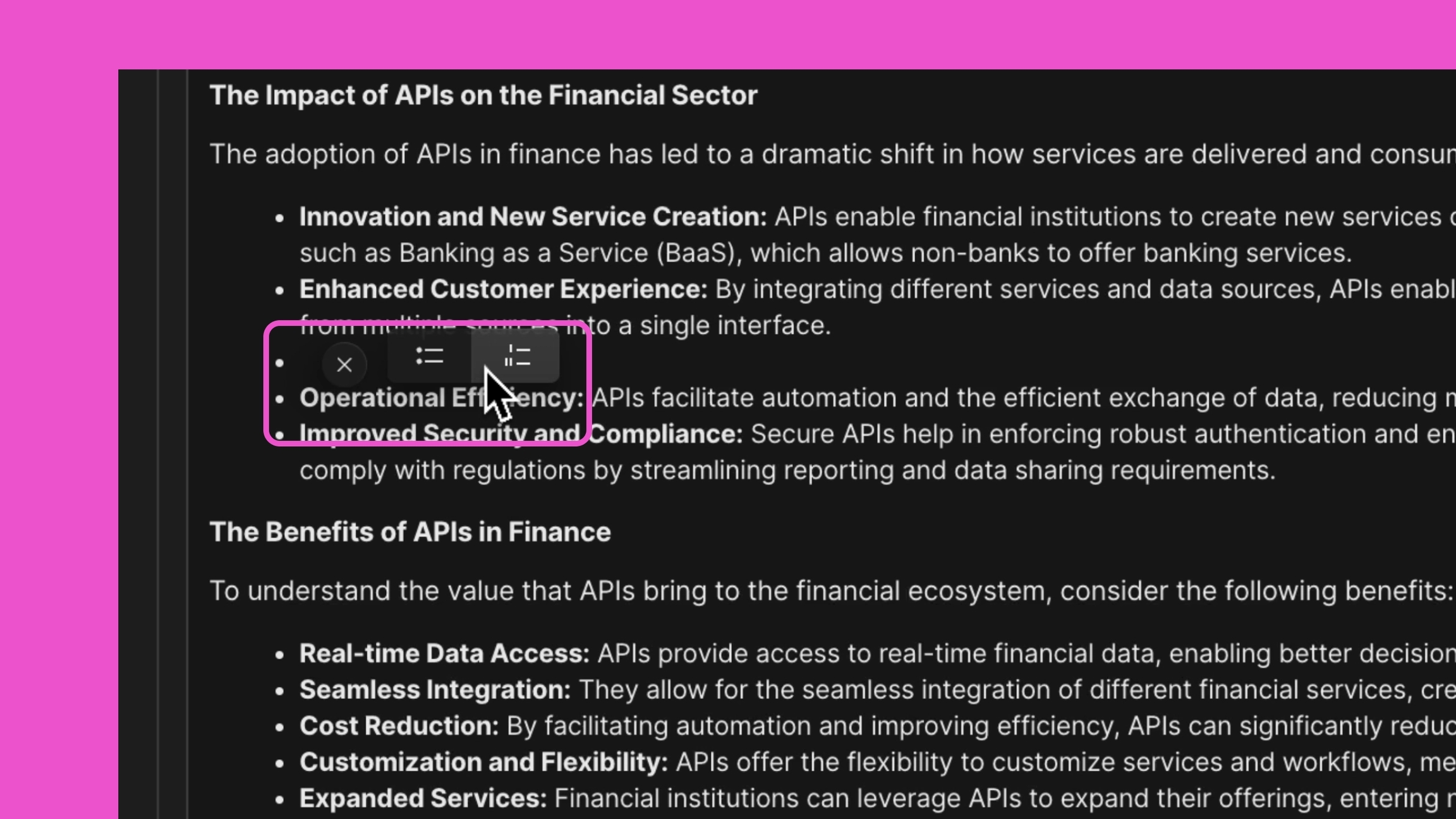 最後,對 Rich text 本元素和欄位中的清單進行了一些(微小但)強大的更新。當選擇有序或無序項目中的文字時,圖示現在允許您切換項目類型。此外,您現在可以在聚焦於任何項目時按 Tab 鍵來巢狀有序或無序列表。按 Shift + Tab 將取消巢狀項目。