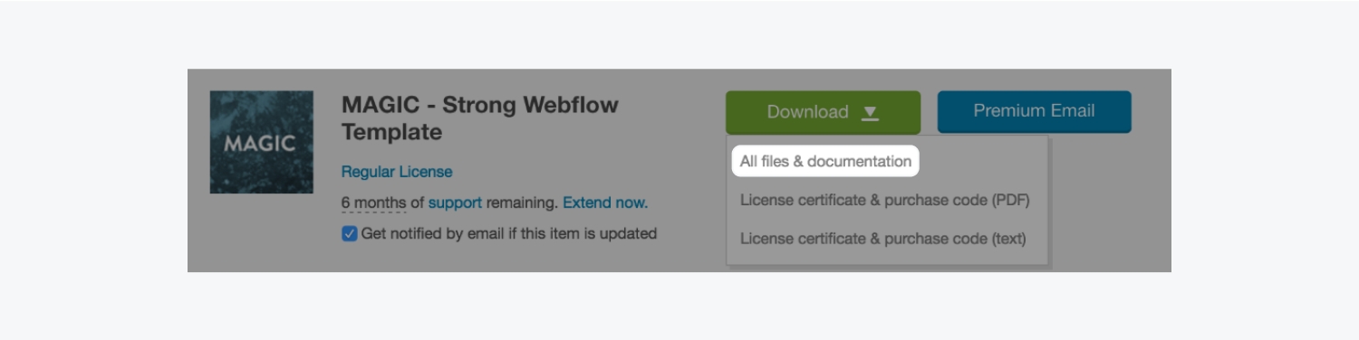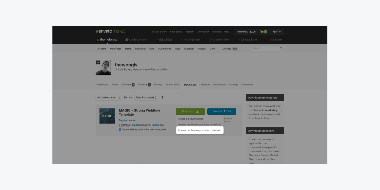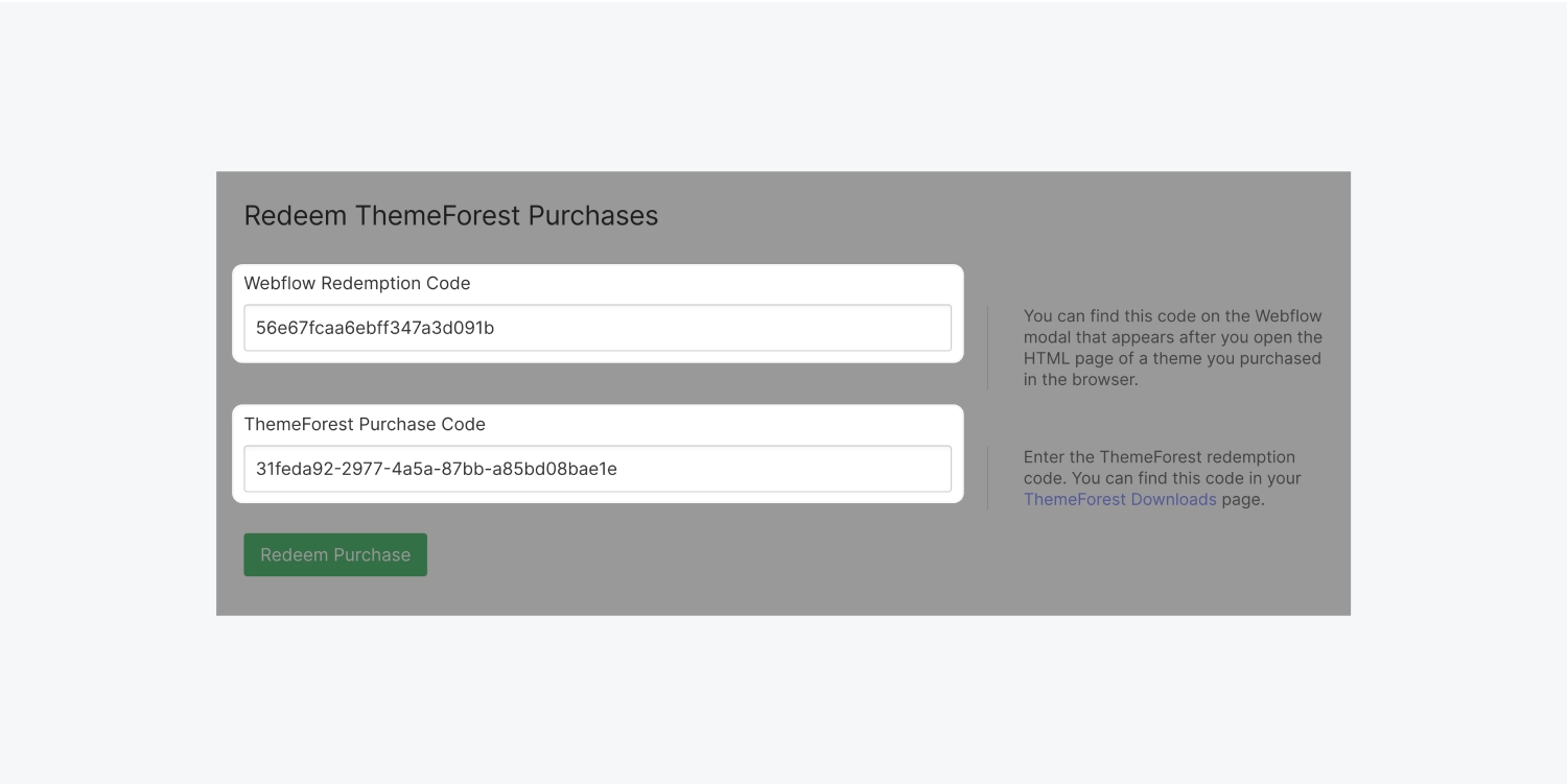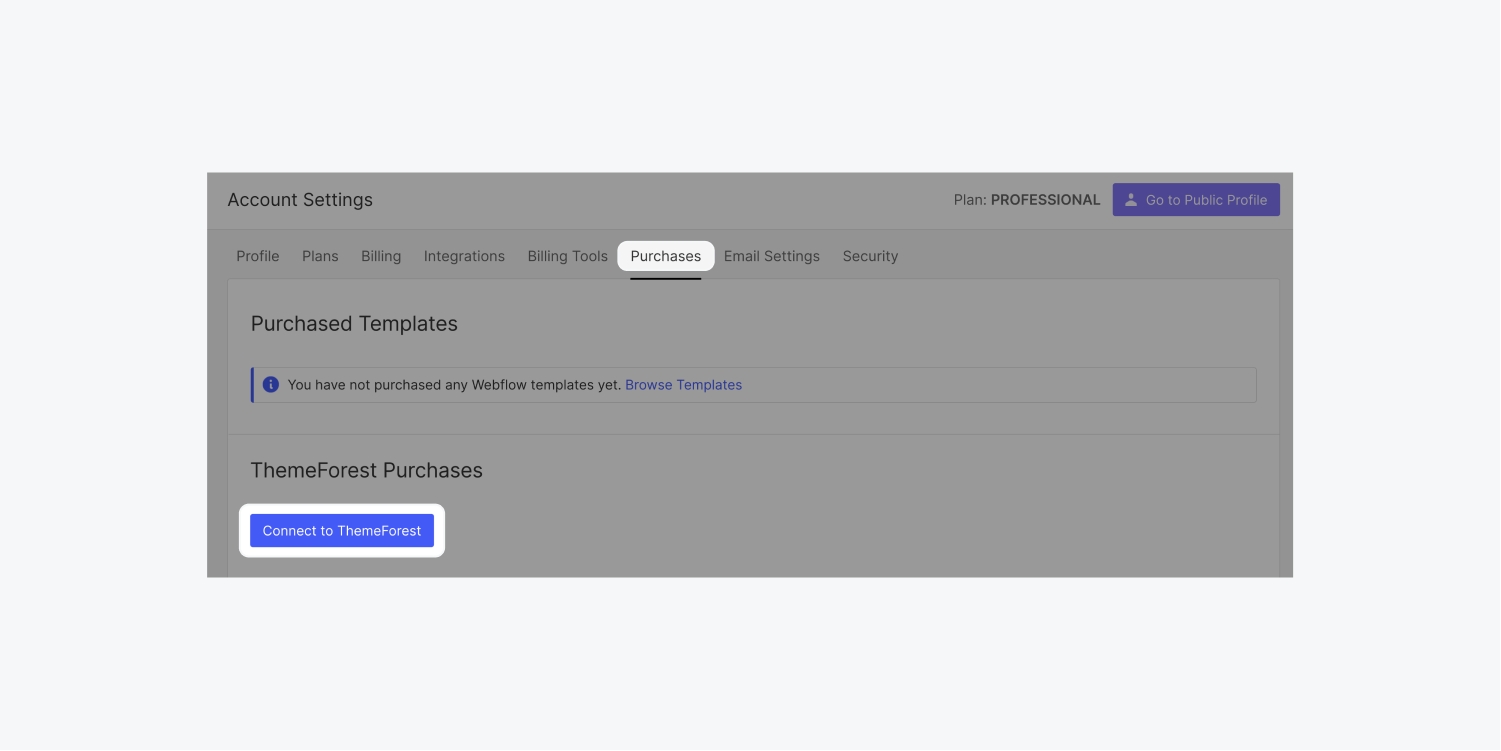 首先,在帳戶設置 > 購買 > ThemeForest購買中,將您的ThemeForest帳戶與您的Webflow帳戶相連。