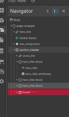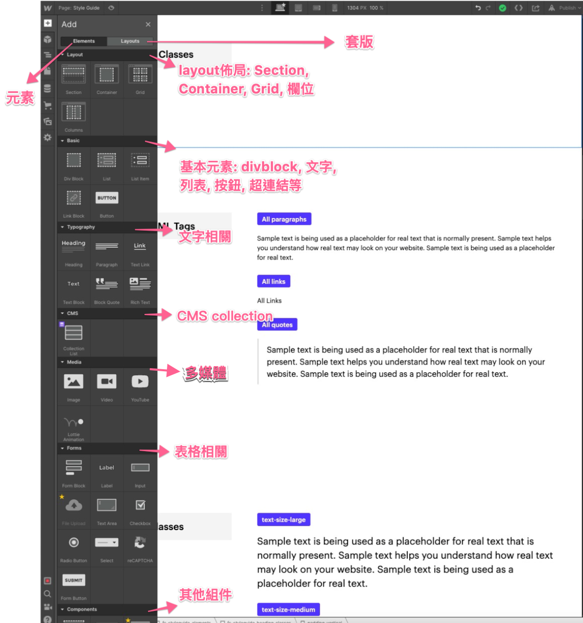 Layout 中這是網頁架構中最最基本的元素。而 Secion -> Container-> Div Block 是網頁開發中常見的層次結構。
