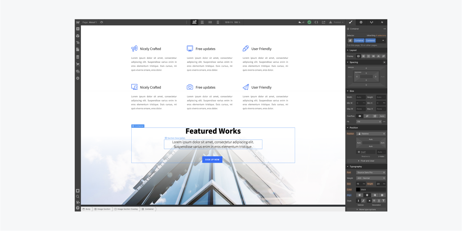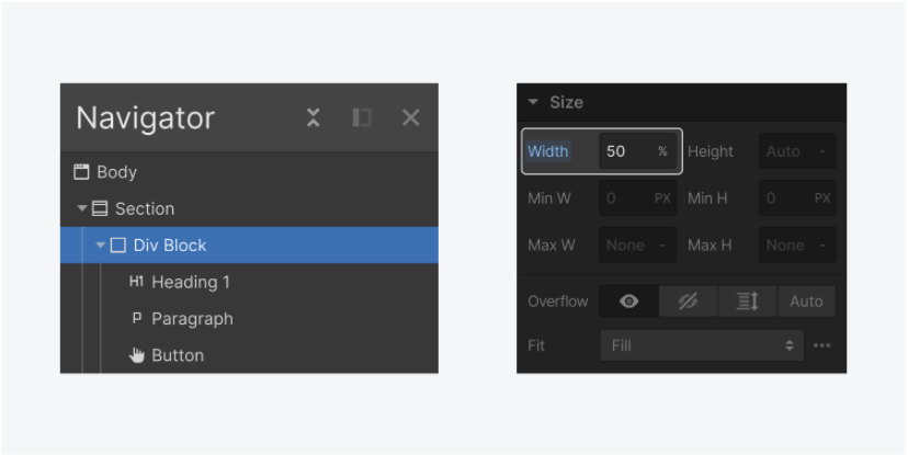 你可以使用 Container 中的 Div Block 使用Layout、Spacing、Size 和 Position 等樣式來組織元素。