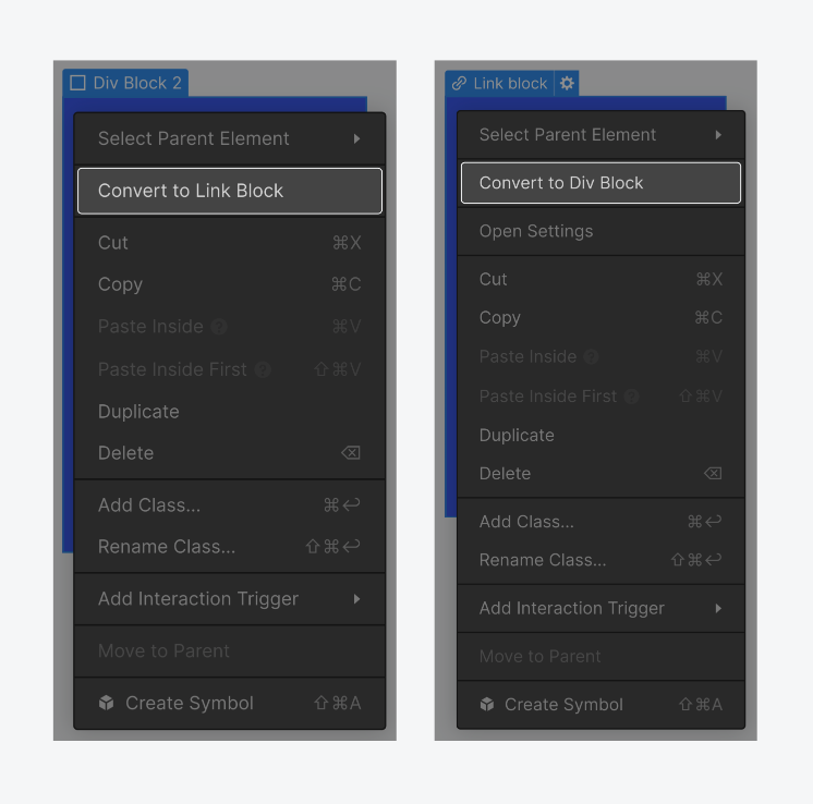 <div class="padding-vertical padding-xxlarge"></div><div id="header"></div>你甚至可以將 Div Block 轉換為超連結,以將其及其內容鏈接到其地方。若要將 Div 塊更改為 Link 塊,請確保 Div 塊不包含任何鏈接元素,然後右鍵單擊 Div 塊並將其轉換為 Link 即可。