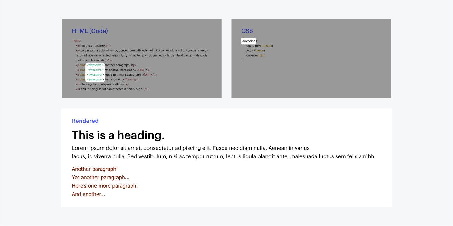 CSS(級聯樣式表)採用所有以前內聯編寫的樣式信息——顏色、邊框、大小、定位、排版等等——並將其移動到帶有類的單獨樣式文檔中。 我們的 HTML 中的任何元素都可以被賦予一個類名,以採用與該類關聯的樣式。